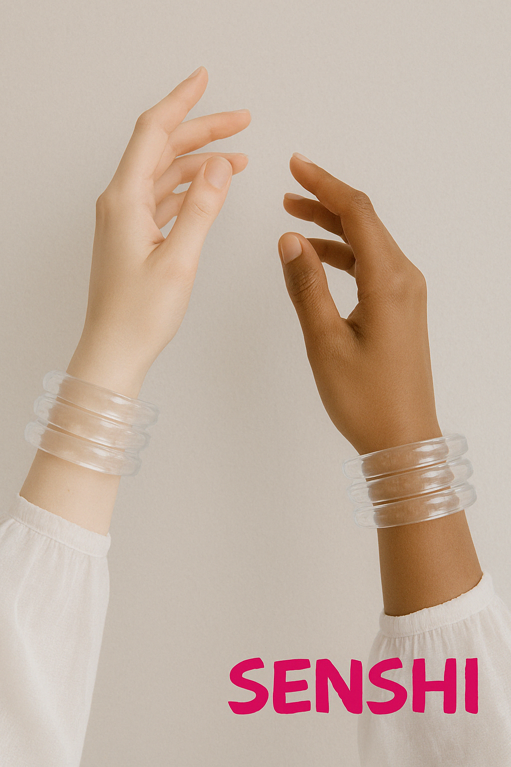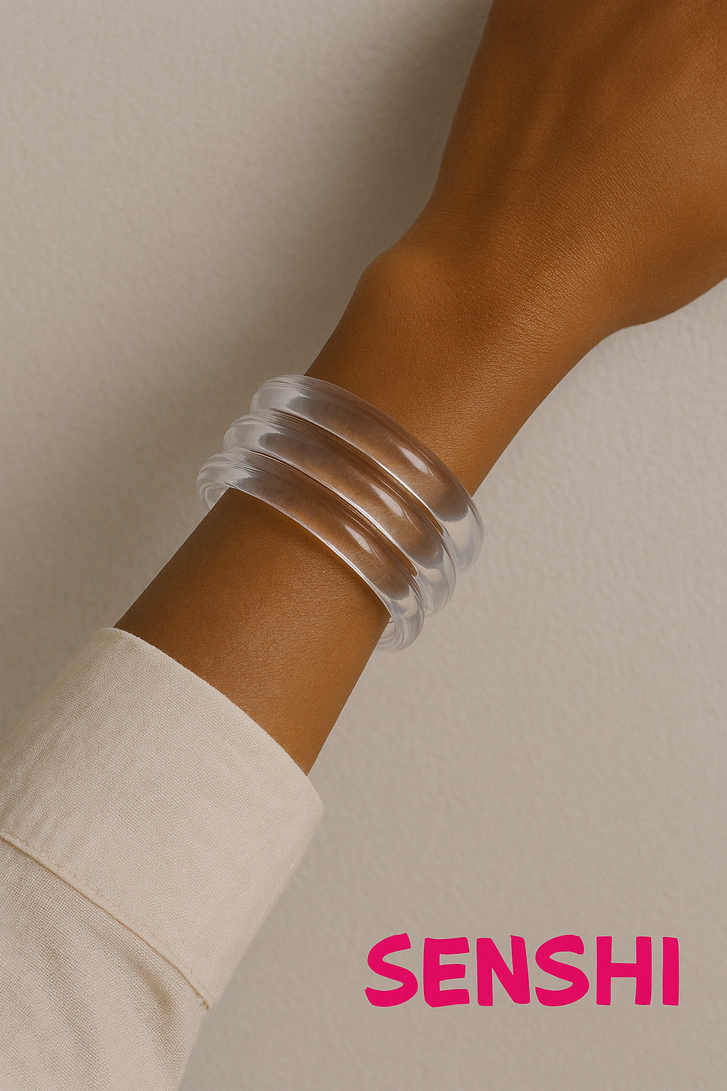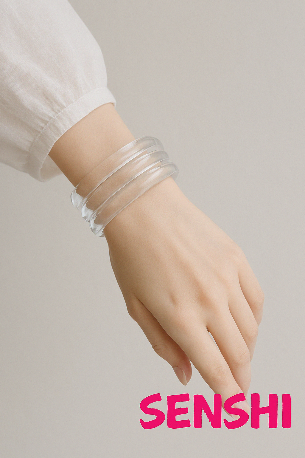 The Cloudglass Cuff is crafted from crystal-clear resin that mimics the softness of glass but feels weightless on your wrist. With sculptural ridges and a dreamy translucence, it pairs effortlessly with every outfit—from minimal whites to maximal prints.