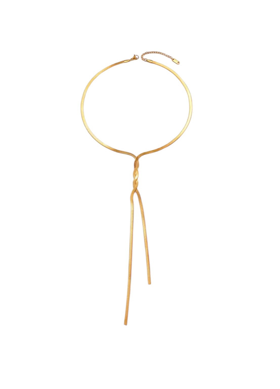 This gold polished tassel necklace has a snake like charm and is long for a deep neck outfit. It adds sparkle to your outfit and highlights your cleavage.