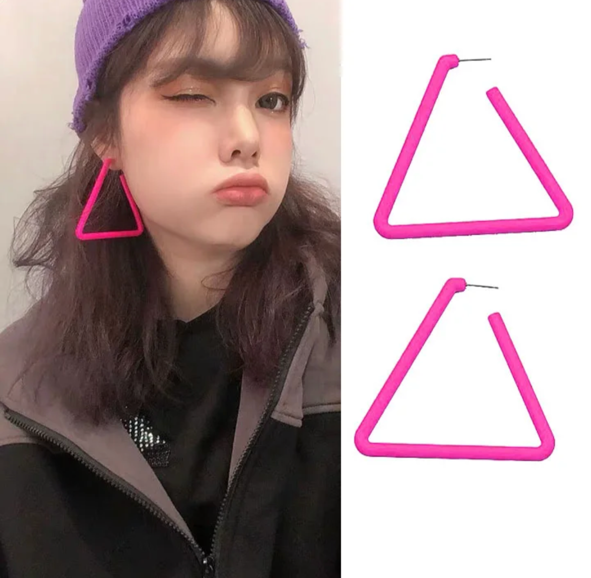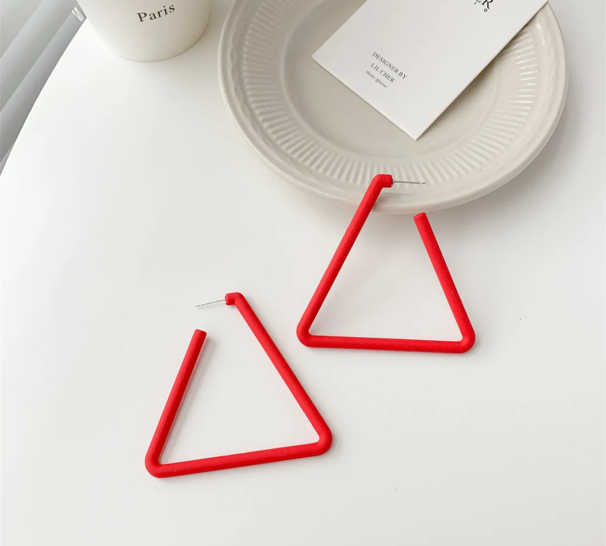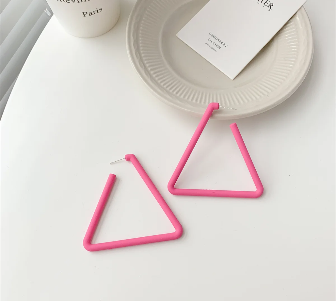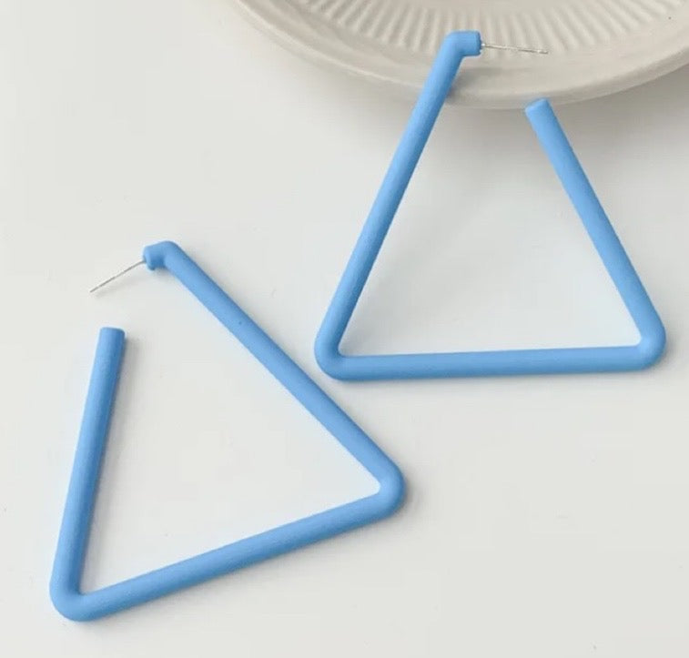 Triangles are more edgy than hoops. While we jump through hoops in life, we need some edginess. Red, Blue, Pink triangles picked just for your situation.