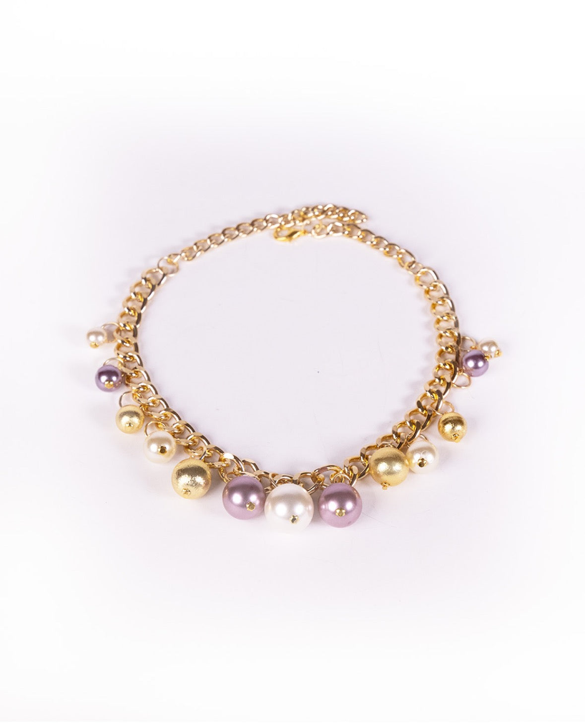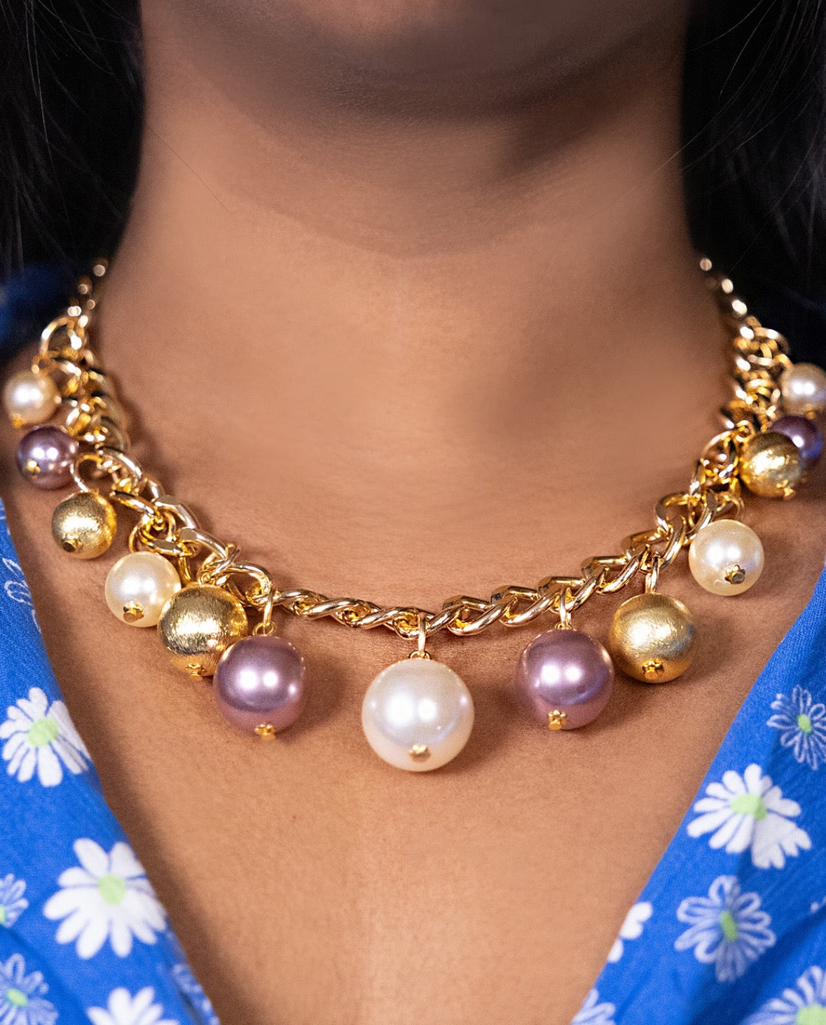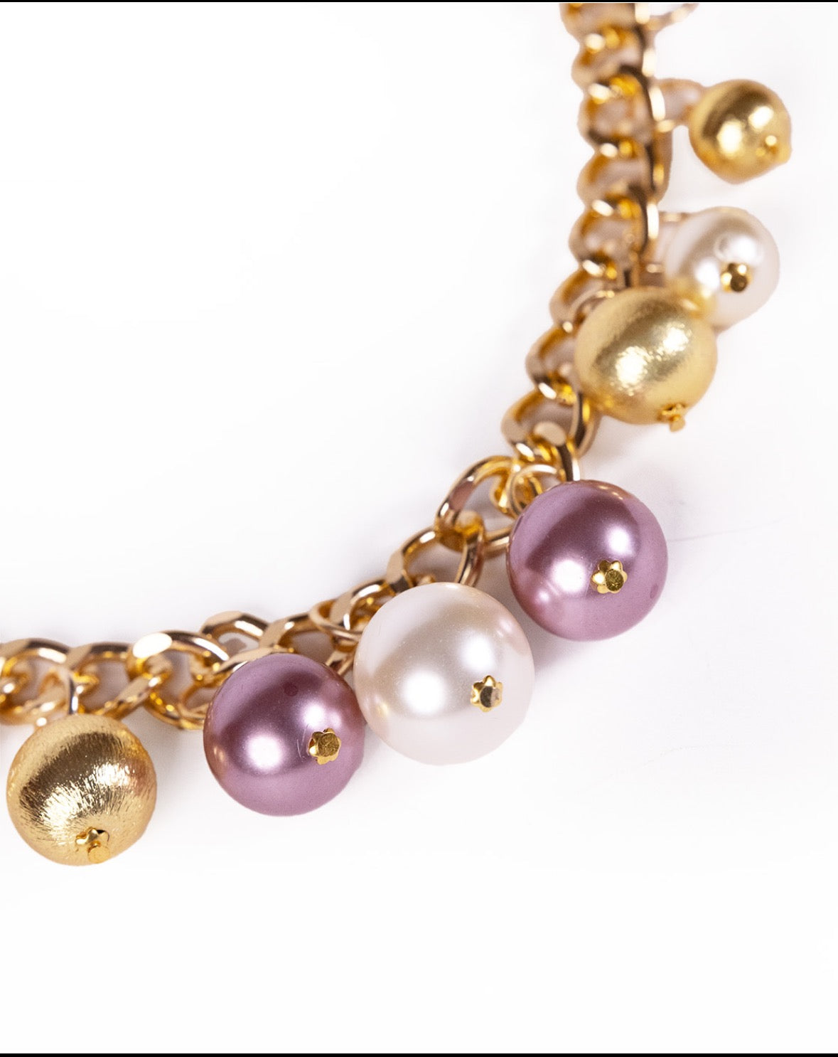 Beautiful necklace with two coloured pearls woven with gold chains.