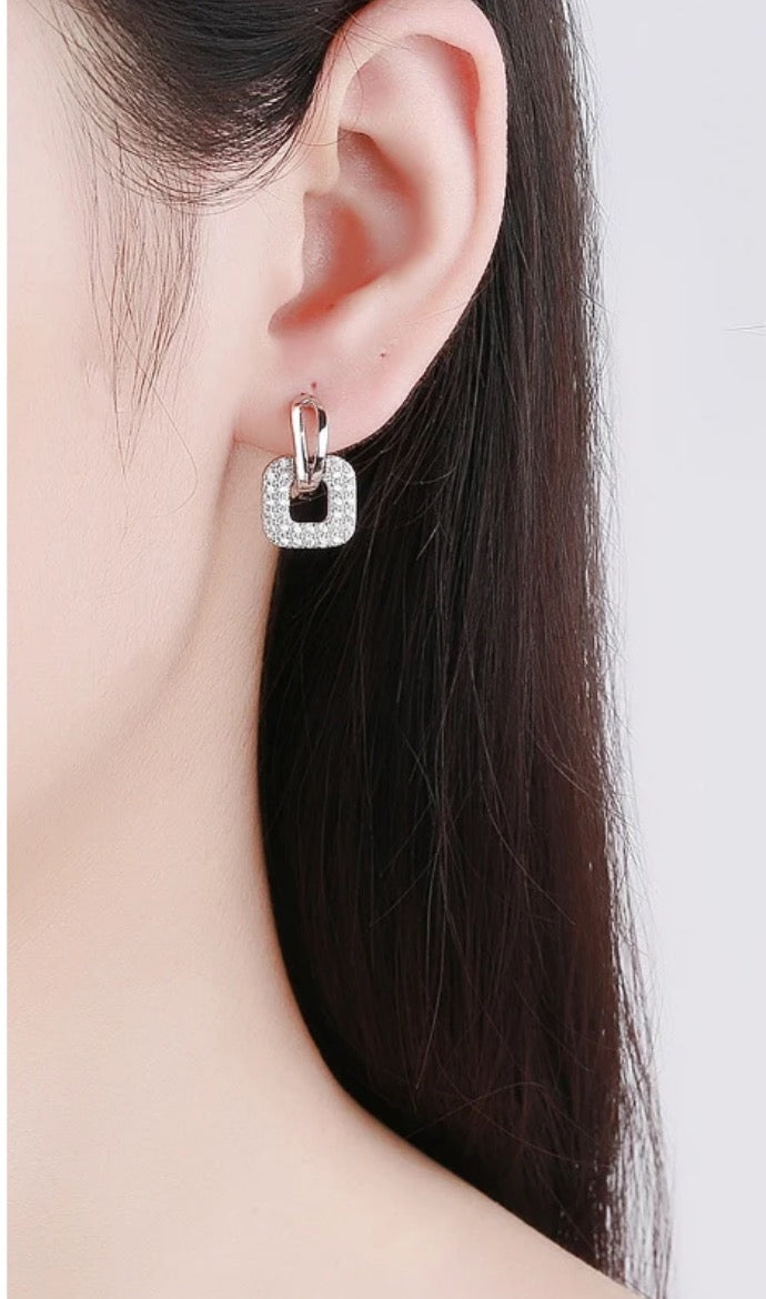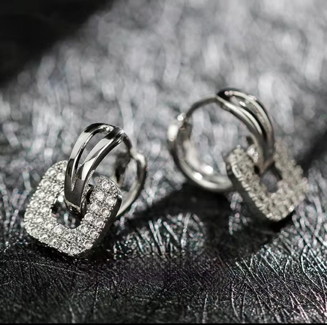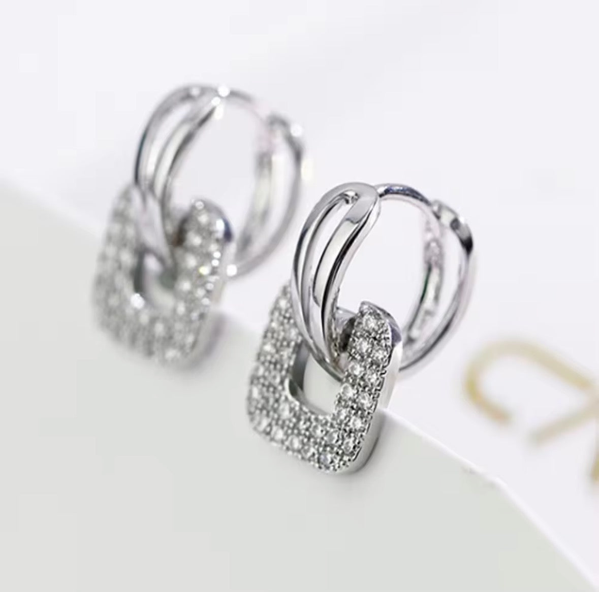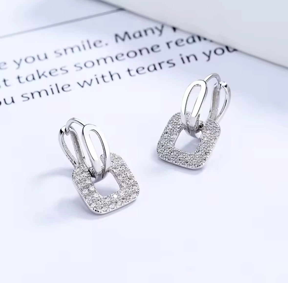Silver geometric earrings with mini crystals. It’s tarnish free and made to add a glitter to your face.