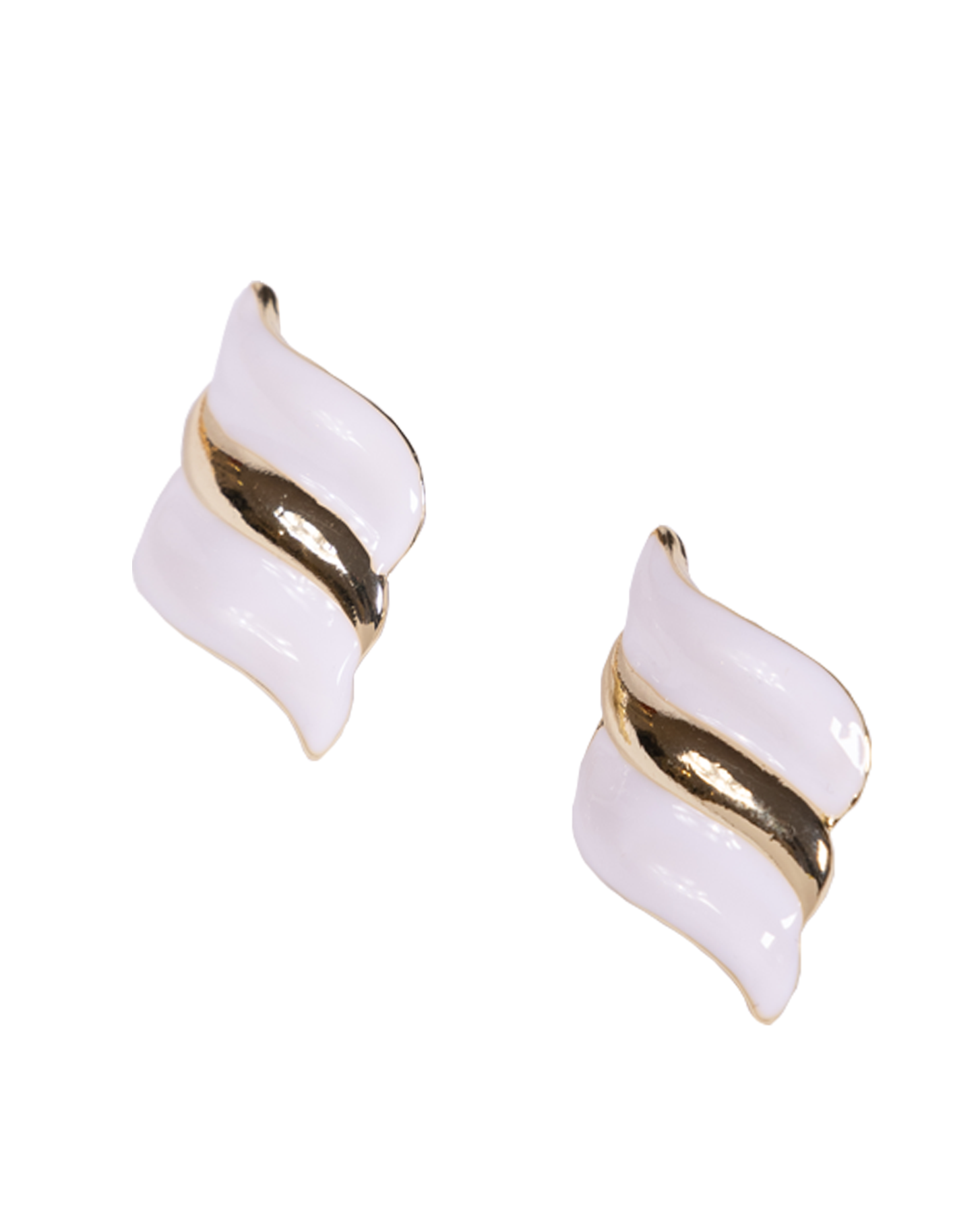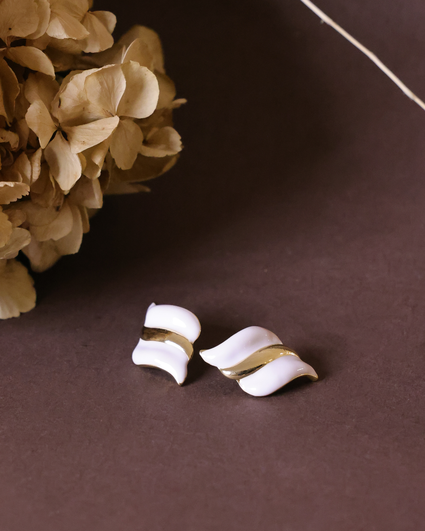 White diagonal, two coloured, stud earrings. They are smart and can be worn to work as well. They are small, cute and look intelligent.